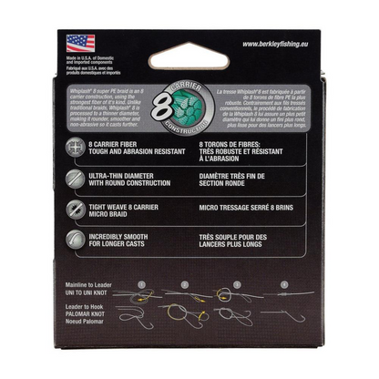 Die Berkley® Whiplash® 8 ist eine geflochtene Angelschnur aus 100 % PE-Fasern mit acht eng verflochtenen Trägern. Sie wurde für den Einsatz sowohl im Süßwasser als auch im Salzwasser entwickelt.