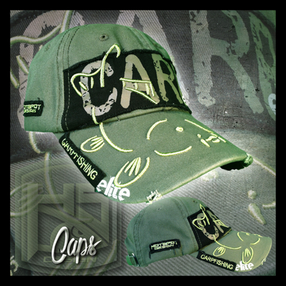 Vorderseite der Kappe: schwarzer Patch mit dem Text „Karpfen“ in Grün und dem Text „Elite“ in einem helleren Grün, der Text „Angeln“ ist auf der linken Seite des Patches aufgestickt. Gestickte 3D-Karpfenzeichnung, die über dem Patch beginnt und bis zum Schirm reicht.